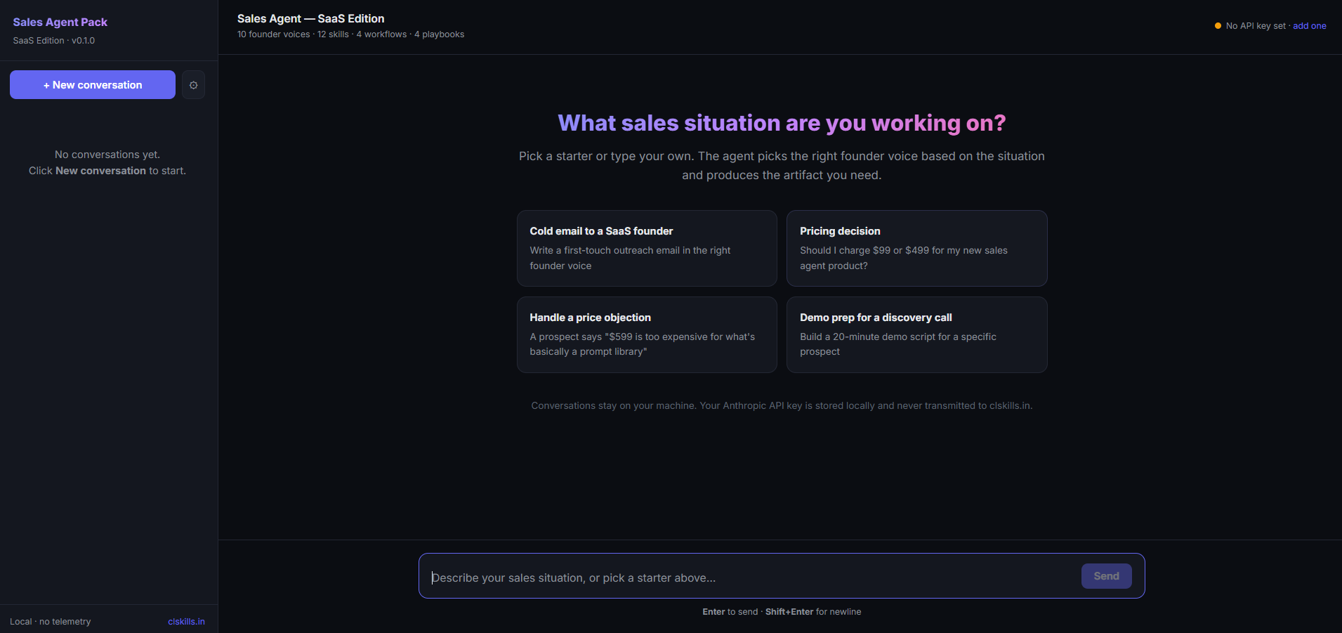I run clskillshub.com — a small one-person shop building AI tools for people who actually use Claude every day. The Sales Agent Pack is the flagship: 21 days of solo build, 10 council voices written from scratch, a Windows installer, and a download flow that all live outside the marketing department because there is no marketing department. If something breaks, you reply to your purchase email and I fix it — usually within 24 hours.